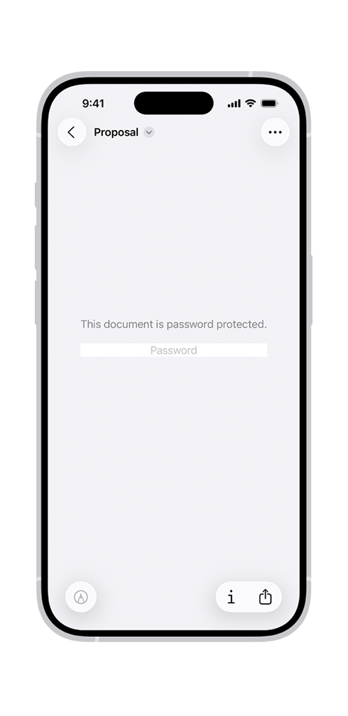 Podes proteger um PDF com uma palavra-passe. Abre um PDF, toca no botão Menu Ações junto ao nome do ficheiro e, em seguida, toca em “Proteger”. Ativa “Pedir palavra-passe” e, depois, introduz uma palavra-passe nos campos “Palavra-passe” e “Verificar”.