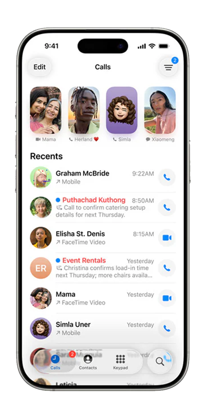 - No iPhone, um ecrã unificado reúne Favoritos, Recentes e Voicemail; Call Screeningfiltra chamadas indesejadas e Hold Assist avisa quando o atendente atende.