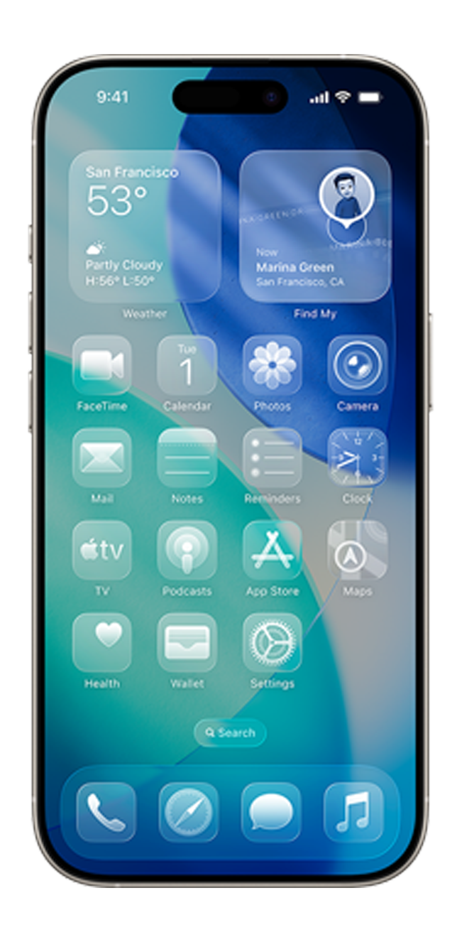 A Apple redesenhou todo o sistema comLiquid Glass, um material translúcido que se adapta à cor do fundo, reflete conteúdo circundante e dá profundidade a ícones, widgets e barras de navegação. NoHome Screene noLock Screen, cada elemento reage à tua foto de fundo, enquanto gestos de scroll encolhem as barras inferiores para maximizar espaço de leitura.