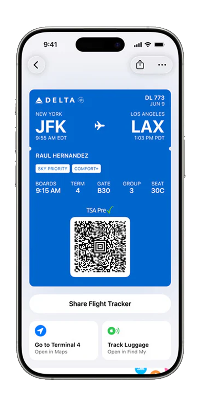- Apple Wallet: pagamentos em prestações ou pontos de recompensa no Apple Pay e boarding passes com Live Activities de voo e atalhos para Find My e Maps.