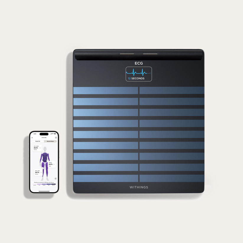 Balança inteligente com pega extensível com eléctrodos. Mede o peso (com precisão até 50g), BMI, massa gordura e músculo por segmentos (braço esq/dto, perna esq/dta, tronco), % água e massa óssea, gordura visceral, idade metabólica, idade vascular/velocidade de onda de pulso, ritmo cardíaco (de pé, ao pesar), e nerve health score. Faz ainda electrocardiograma ECG de 6 derivações e detecta AFib; outros relatórios e serviços requerem subscrição Health+. Tem ecrã LCD 3.2", modo gravidez e bebé, reconhece até 8 utilizadores, bateria recarregável por USB-C com autonomia até 1 ano, sincroniza por wifi e bluetooth. Compatível iOS 12+ ou Android 8+.